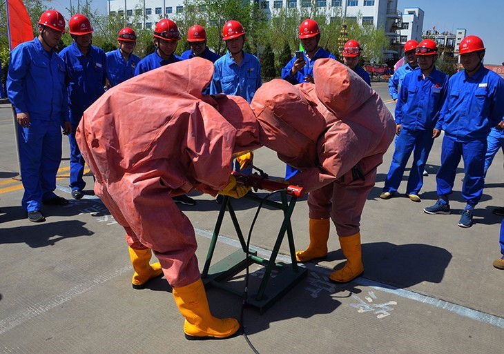 4月27日下午,烏達化工5個分廠(部室)開展了應急救援技能比武活動。比武共設置有兩人三帶連接、空呼器組裝穿戴、火場救援、管道打卡堵漏4個項目。