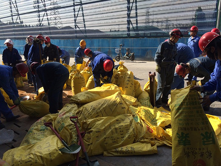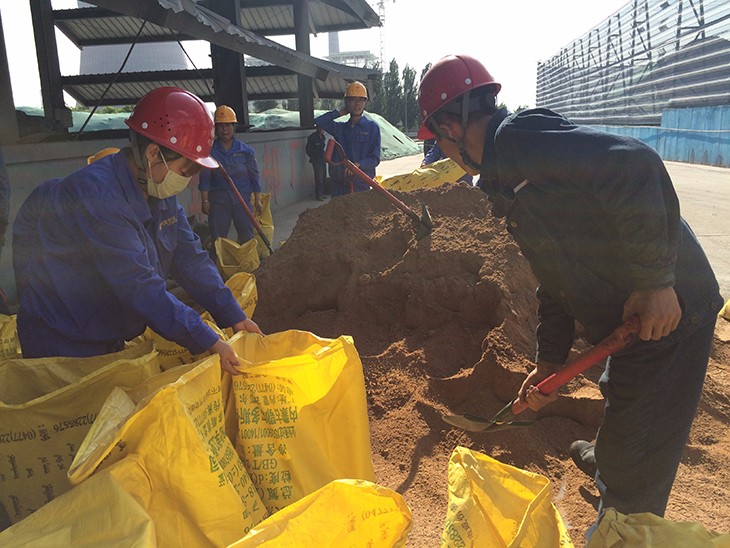 由于水勢較大,部分電石已接觸水源,正在吞噬電石與之發生化學反應,有發生火災爆炸的可能。此時車間救援力量已遠遠不夠,立即向分廠匯報。分廠及時調動鏟車運來沙子,各車間救援小組也都紛紛來“事故”現場裝填沙袋,并對地勢低洼的區域用沙袋堆垛,形成堤壩擋住雨水……監測、警戒、救援及疏散等工作迅速、有序地開展中。